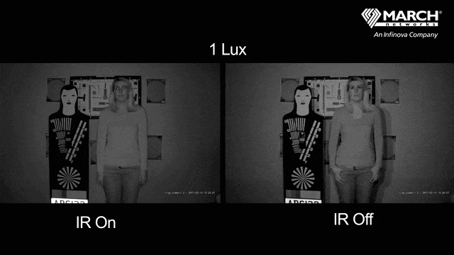 In this example below, you can see what happens when IR is enabled, versus when it’s not. See how the IR camera on the left keeps illuminating the subject, even at 0 lux, while the camera on the right without IR is unable to pick up anything? Without IR, the field of view eventually goes black.