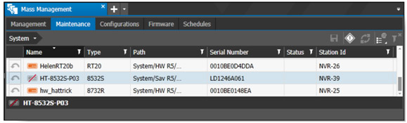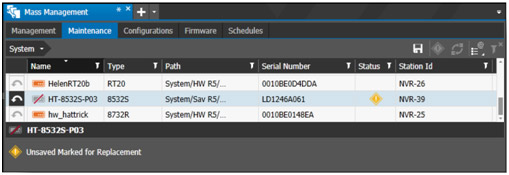- Go to Tools in the CES workspace and choose Mass Management. In the Maintenance subtab, select the offline recorder you want to replace and click the diamond-shaped Mark Device for Replacement icon on the right-hand side of the toolbar.