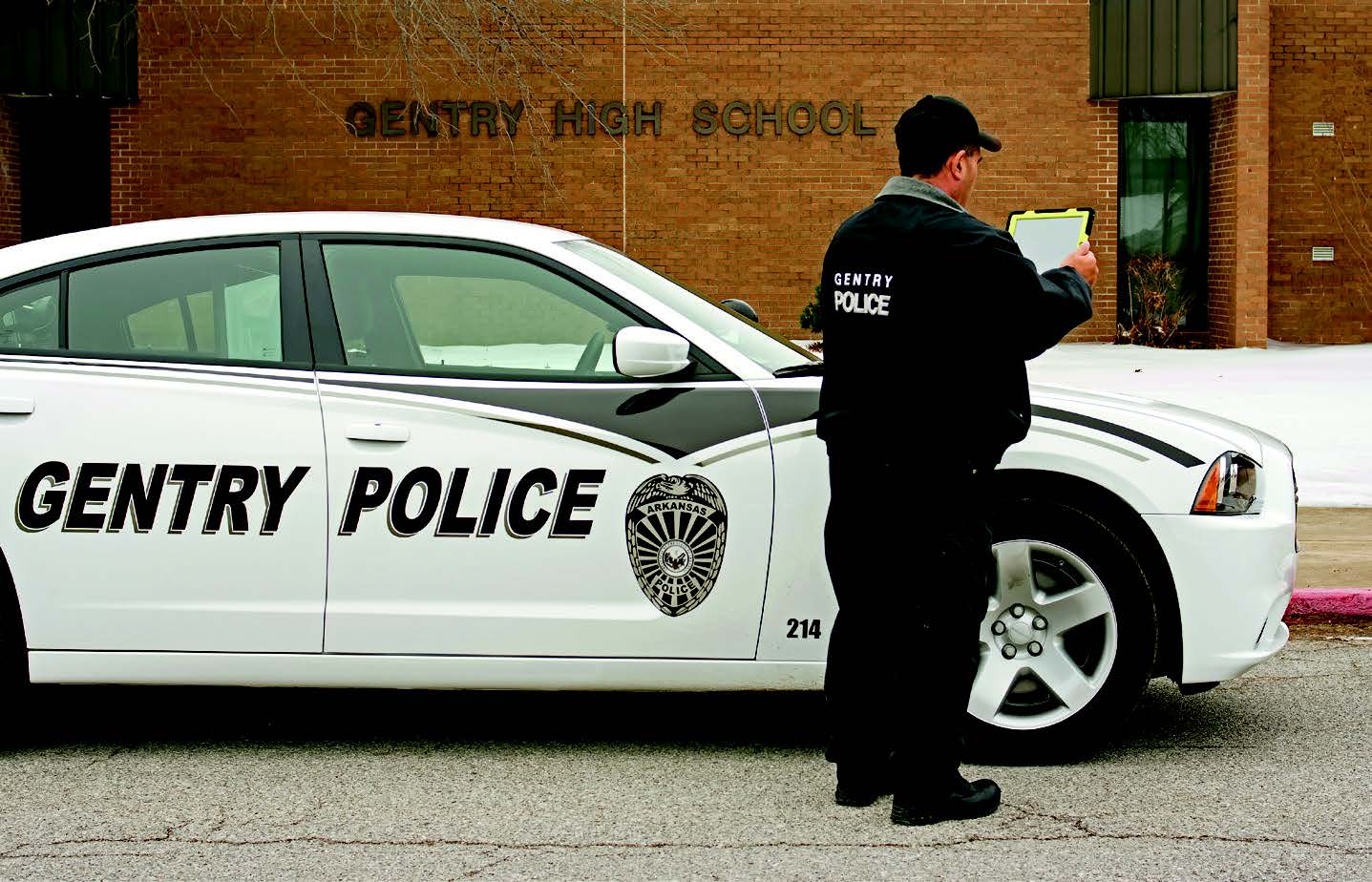 Image of a Gentry police officer on their iPad outside of a Gentry High School.