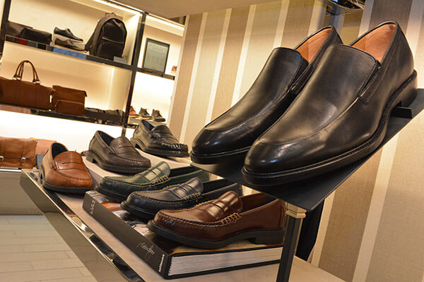 a row of men’s shoes inside a Cole Haan location
