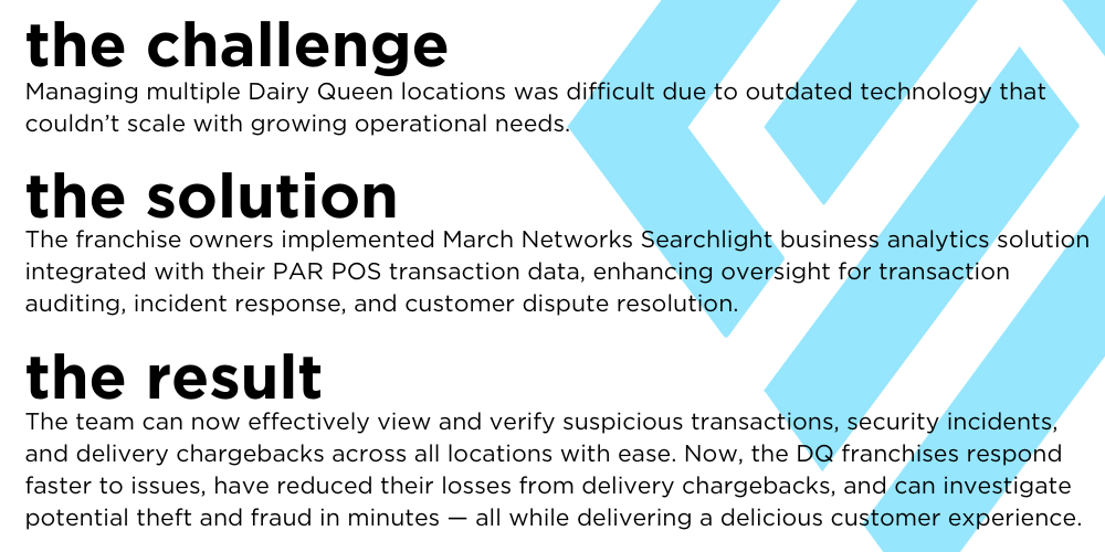“When we looked at March Networks, I thought, ‘This is way smarter and way more advanced than what we currently have’. And since it was on Dairy Queen’s vendor list, we decided, ‘Let’s give it a try,’” said Lori.