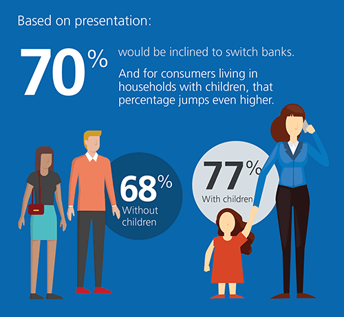 Survey results also show that a continued focus on the customer experience remains critical for banks and credit unions when it comes to retention. One in 5 respondents confirmed that they had switched banks in the past year because of poor in-branch service. Further, 70% said they would consider switching banks if their local branch did not appear clean and tidy – with that number rising to 77% for consumers living in households with children.